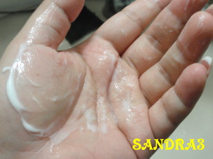 PR-117青春露精華霜質地為白色乳狀 按壓式瓶口上的小孔很小所以一次擠出的量相當少 圖中用於長髮中後段的用量約按壓4~5下 此款護髮素為免沖洗式所以建議在洗頭後頭髮8分乾時使用 013是在洗頭過一陣子後用 <不喜歡吹頭髮老是被設計師唸的人XD 使用時先擠適量護髮產品於雙掌間 再將其大致抹開於掌心及指縫間